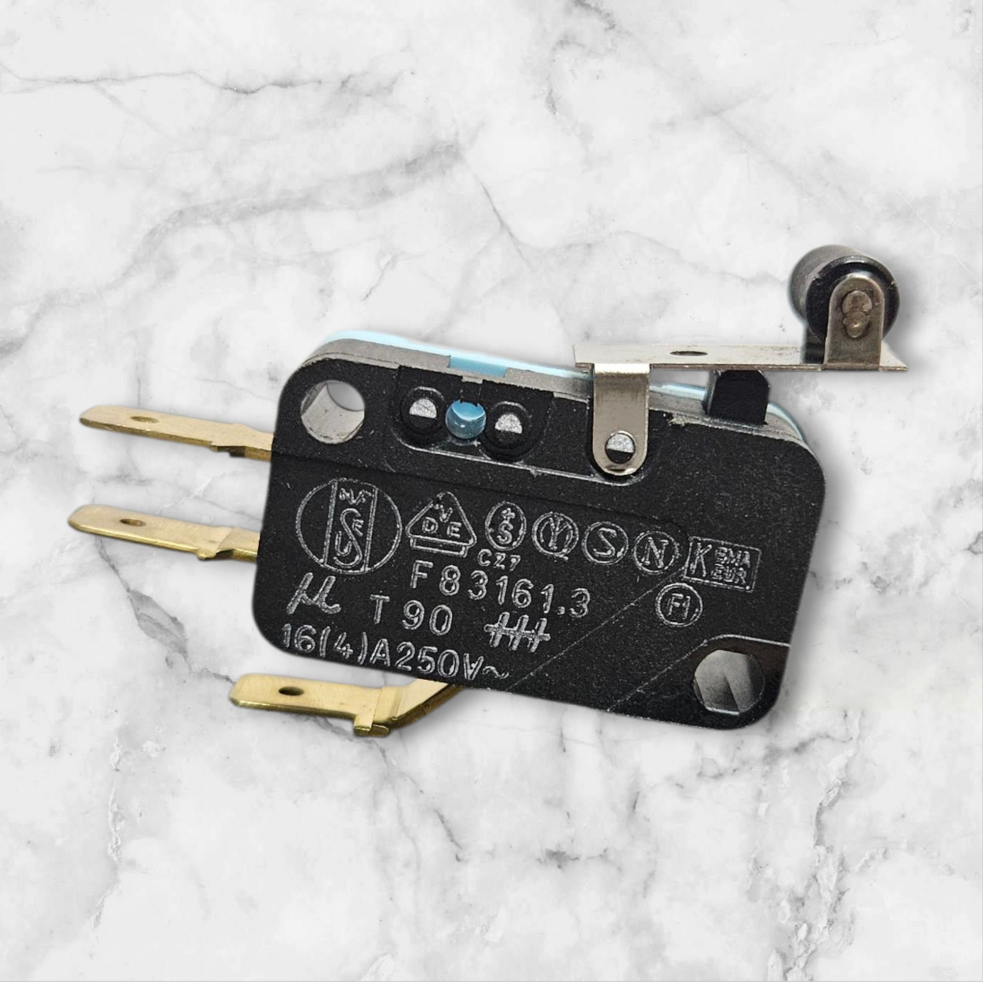 The Crouzet F83161.3 is a precision micro switch featuring a roller-type actuator, engineered for reliable operation in demanding industrial applications. This component delivers consistent electrical switching performance with minimal actuation force, making it ideal for automation equipment, machinery controls, and safety systems. The roller design provides smooth engagement and extended operational life, while maintaining precise contact reliability. Built to Crouzet's exacting standards, this micro switch offers dependable performance in temperature-sensitive and high-cycle environments. Essential for OEM manufacturers and maintenance professionals requiring proven switching solutions.